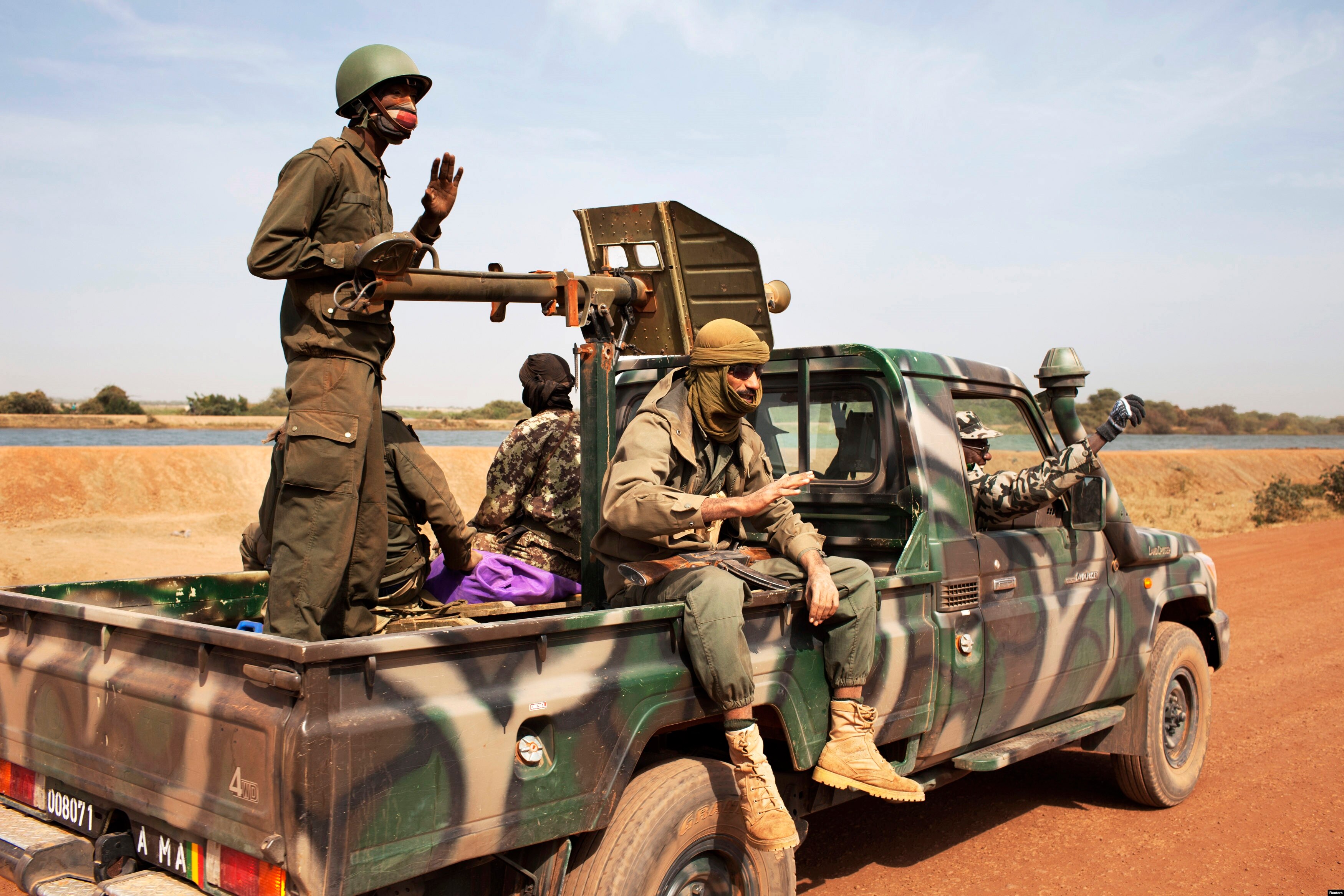 Malian soldiers ride in an army pickup truck in Diabaly, January 26, 2013.
