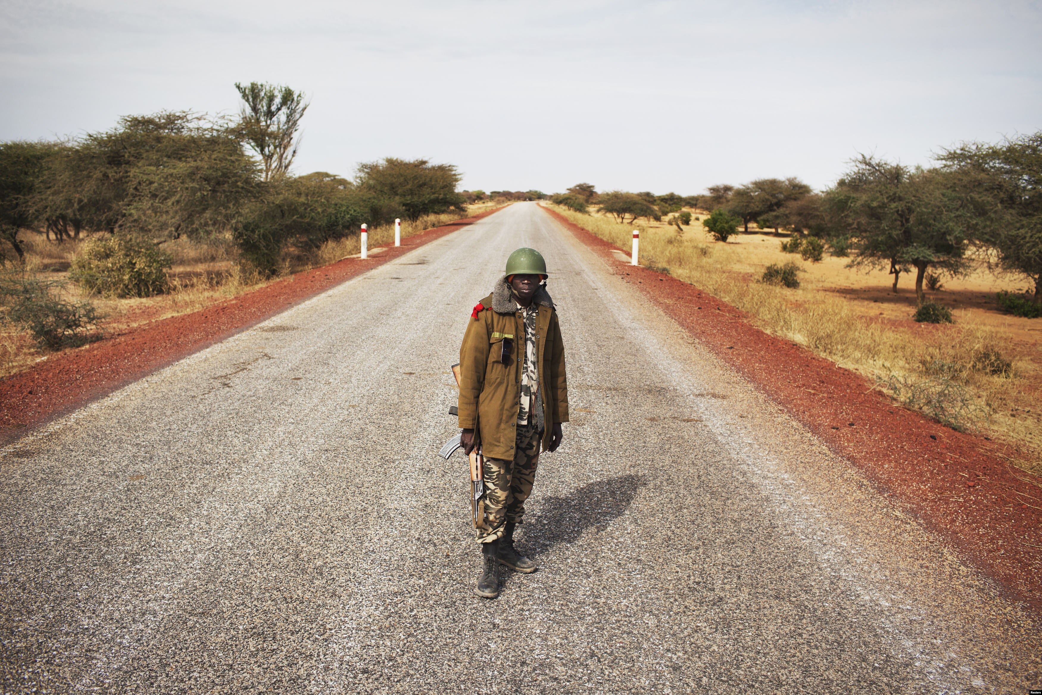 Malian soldier Ousmane Cisse stands guard on an open road outside Sevare, Mali, January 27, 2013.